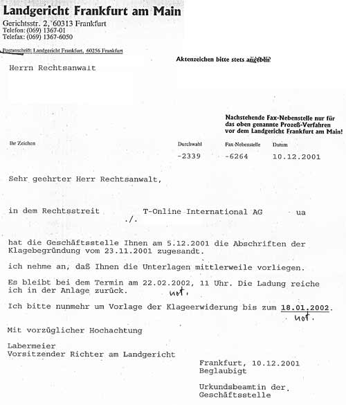 13.12.01 - Die Sache geht vor das Landsgericht Frankfurt